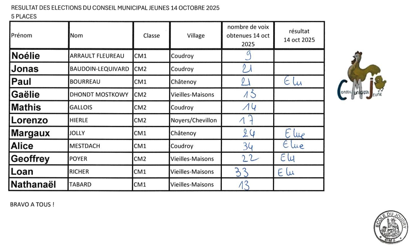 RESULTAT ELECTIONS CONSEIL MUNICIPAL JEUNES de Coudroy – Vieilles-Maisons – Châtenoy